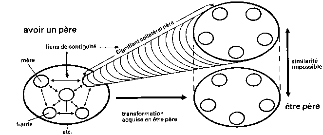 : - au concept analytique de père ; - aux signifiants du même nom. On observera sur ce point l'ajustement des lois dérivées des concepts psychanalytiques et des lois dérivées de la linguistique structurale. Notons que si la sexualité et la conjugalité participent de ce processus de façon très visible, elles n'en constituent nullement la cause déterminante. Celle-ci est imputable à la mutuelle exclusion des procès de dévoilement du réel. De plus ce raisonnement s'applique identiquement à l'identité féminine sans nécessité de recourir aux contorsions théoriques que cette question a pu faire surgir. | ||