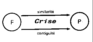 proximité - contiguïté. Ce que nous savons de l'antagonisme contigu / similaire montre que, sur ce point surgit une opposition critique, la similarité étant impossible dans la contiguïté. On ne manquera pas de noter que cette crise : - d'une part, sous le nom de crise oedipienne constitue le point central des théories analytiques ; - d'autre part objective au mieux le conflit des ordres antagonistes que nous a fait connaître la linguistique structurale. | ||